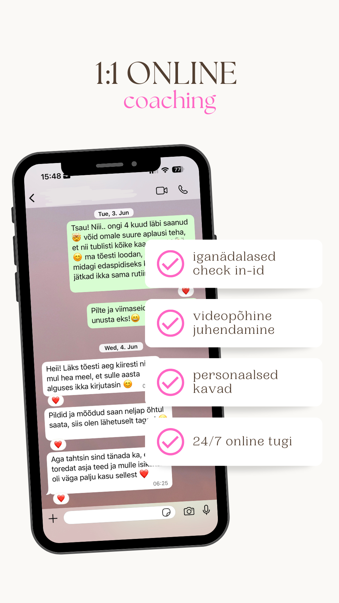 Kui oled motiveeritud, valmis pühenduma ning oma elustiili täielikult muutma, siis online coaching on just sulle! Olen Sinu kõrval igal sammul – olgu eesmärgiks kaalulangus, lihasmassi kasvatamine või lihtsalt tervislikum eluviis. Koos paneme paika eesmärgid, kujundame sulle sobiva plaani ning keskendume sellele, et need päriselt teoks saaksid.